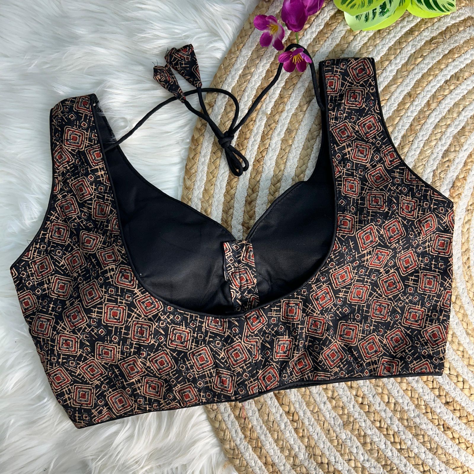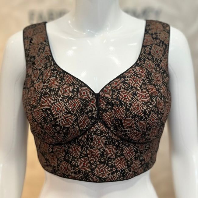 RARA AJRAKH SLEEVELESS BLOUSE (SLEEVE ATTACHED) – FREE SIZE UPTO 44 (BLACK WITH BROWN)