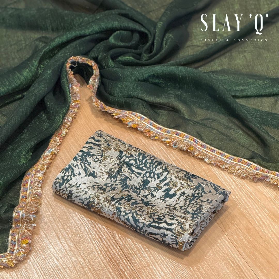SLAY Q IRIS SERIES READYMADE SAREE WITH PLAIN & EXTRA UNIQUE BROCADE BLOUSE | METALLIC SHINE SAREE FABRIC – EMERALD DUSK