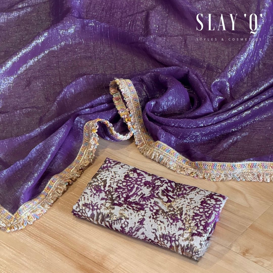 SLAY Q IRIS SERIES READYMADE SAREE WITH PLAIN & EXTRA UNIQUE BROCADE BLOUSE | METALLIC SHINE SAREE FABRIC – ROYAL PURPLE
