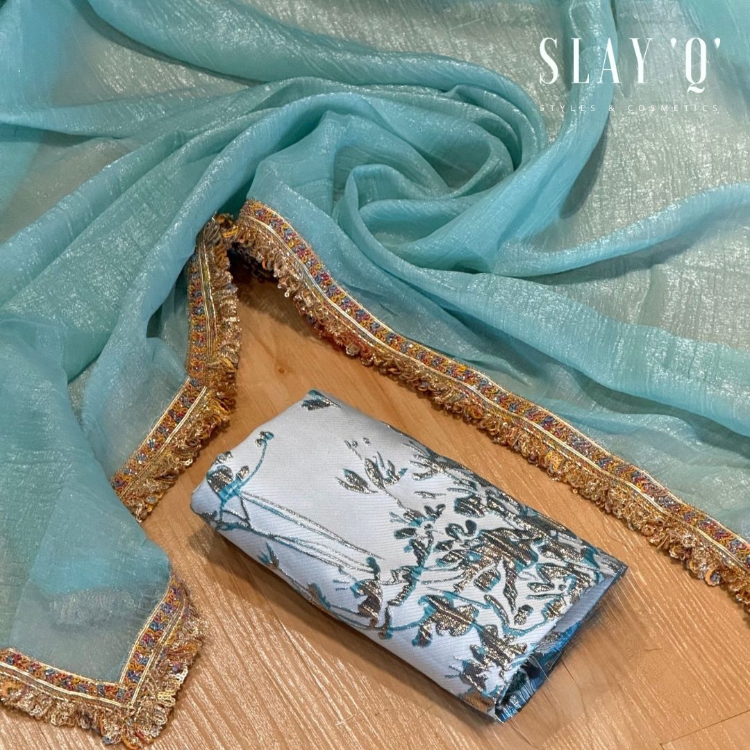 SLAY Q IRIS SERIES READYMADE SAREE WITH PLAIN & EXTRA UNIQUE BROCADE BLOUSE | METALLIC SHINE SAREE FABRIC – AQUA FROST