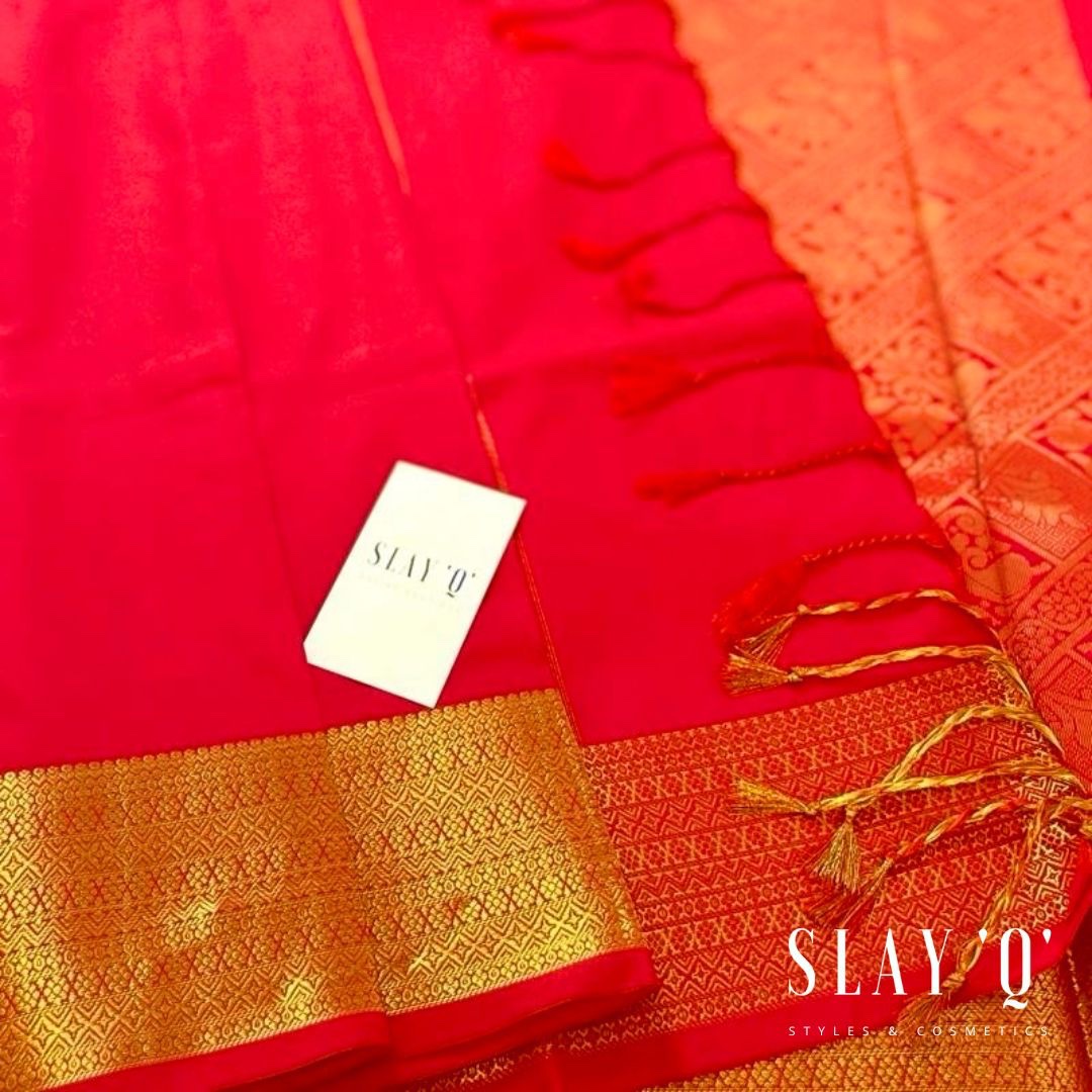 SLAY Q NESA SERIES | PLAIN PATTU SAREE WITH RUNNING BLOUSE & BEAUTIFUL GOLD ZARI BORDER | BRIDESMAID SAREE – CHILLI RED