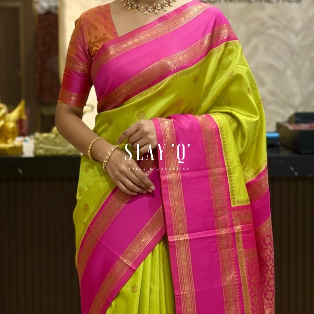 SLAY Q | SOFT SILK SAREE WITH CONTRAST BLOUSE MATERIAL | SUITABLE FOR BRIDESMAIDS Fabric – PARROT GREEN + HOT PINK