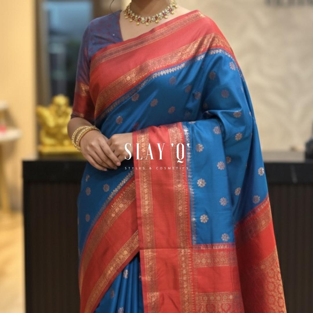 SLAY Q | SOFT SILK SAREE WITH CONTRAST BLOUSE MATERIAL | SUITABLE FOR BRIDESMAIDS Fabric – TEAL BLUE + RED BORDER