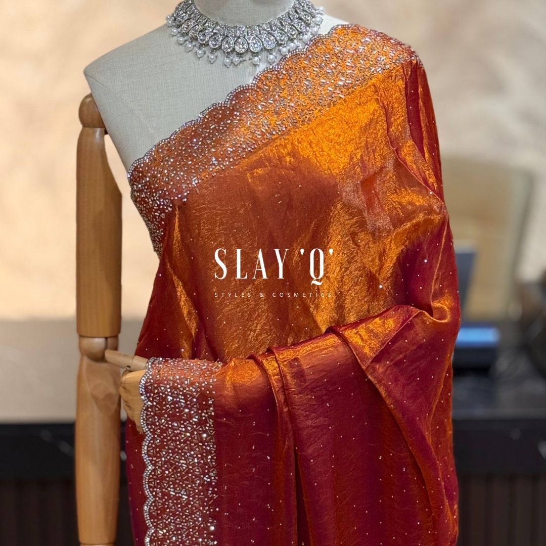 SLAY Q LAYA DINNER SAREE SERIES | STONE WORK | RUNNING BLOUSE – BURNT ORANGE