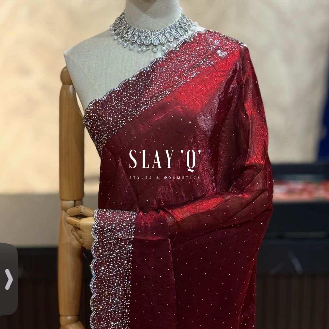 SLAY Q LAYA DINNER SAREE SERIES | STONE WORK | RUNNING BLOUSE – ROYAL MERLOT