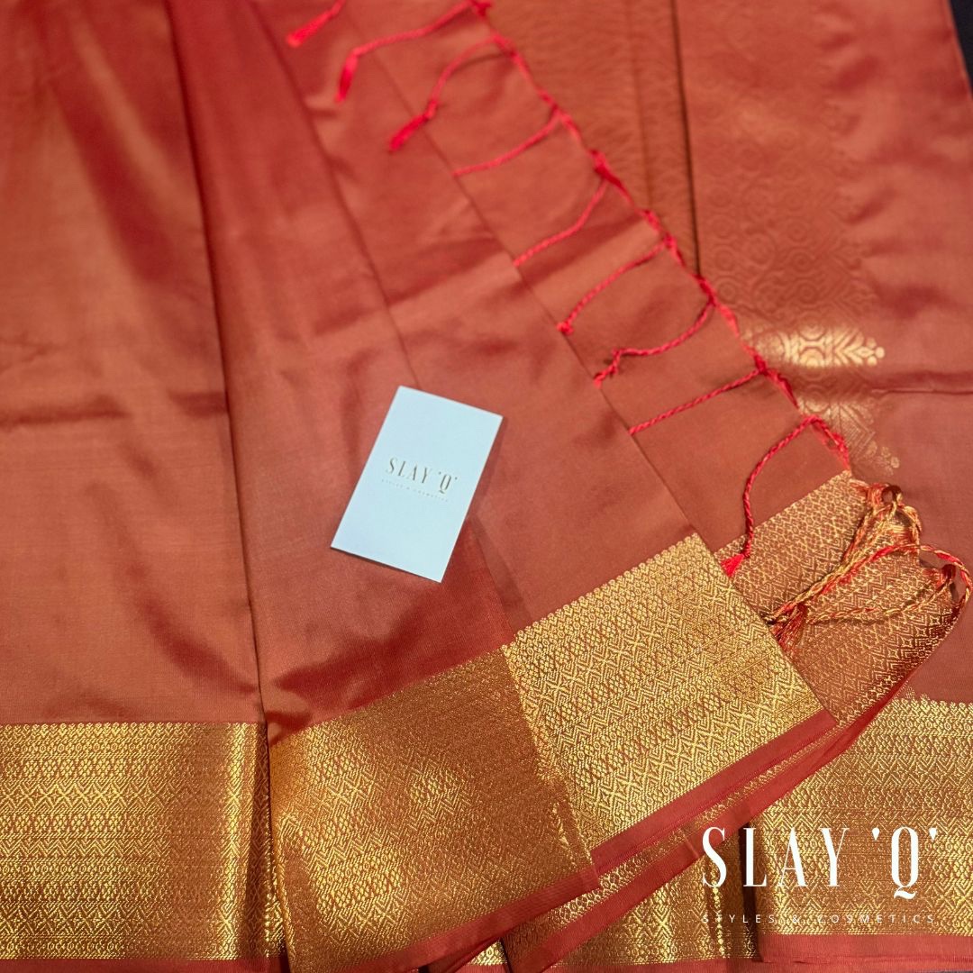 SLAY Q NESA SERIES | PLAIN PATTU SAREE WITH RUNNING BLOUSE & BEAUTIFUL GOLD ZARI BORDER | BRIDESMAID SAREE – BURNT ORANGE
