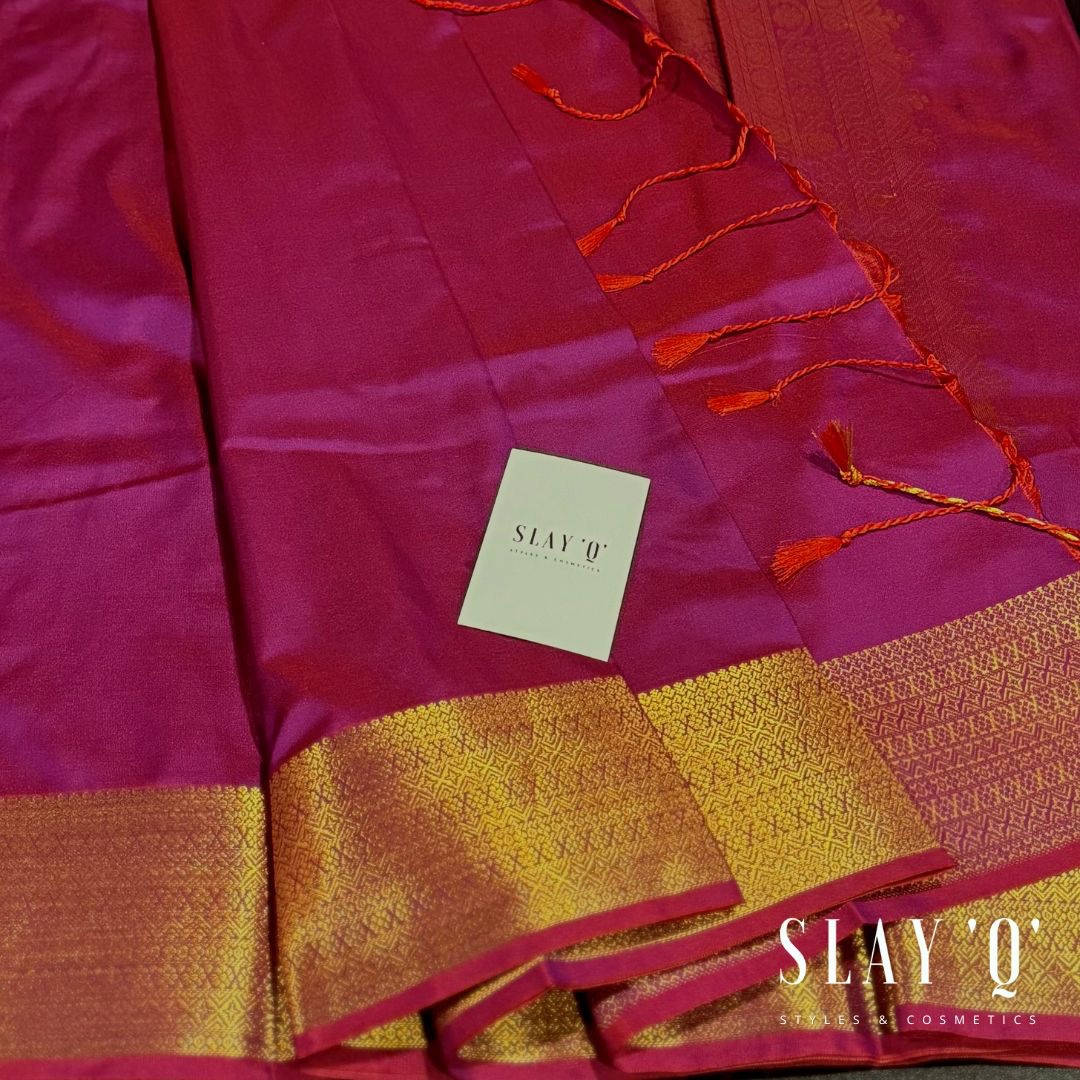 SLAY Q NESA SERIES | PLAIN PATTU SAREE WITH RUNNING BLOUSE & BEAUTIFUL GOLD ZARI BORDER | BRIDESMAID SAREE- FUCHSIA PINK