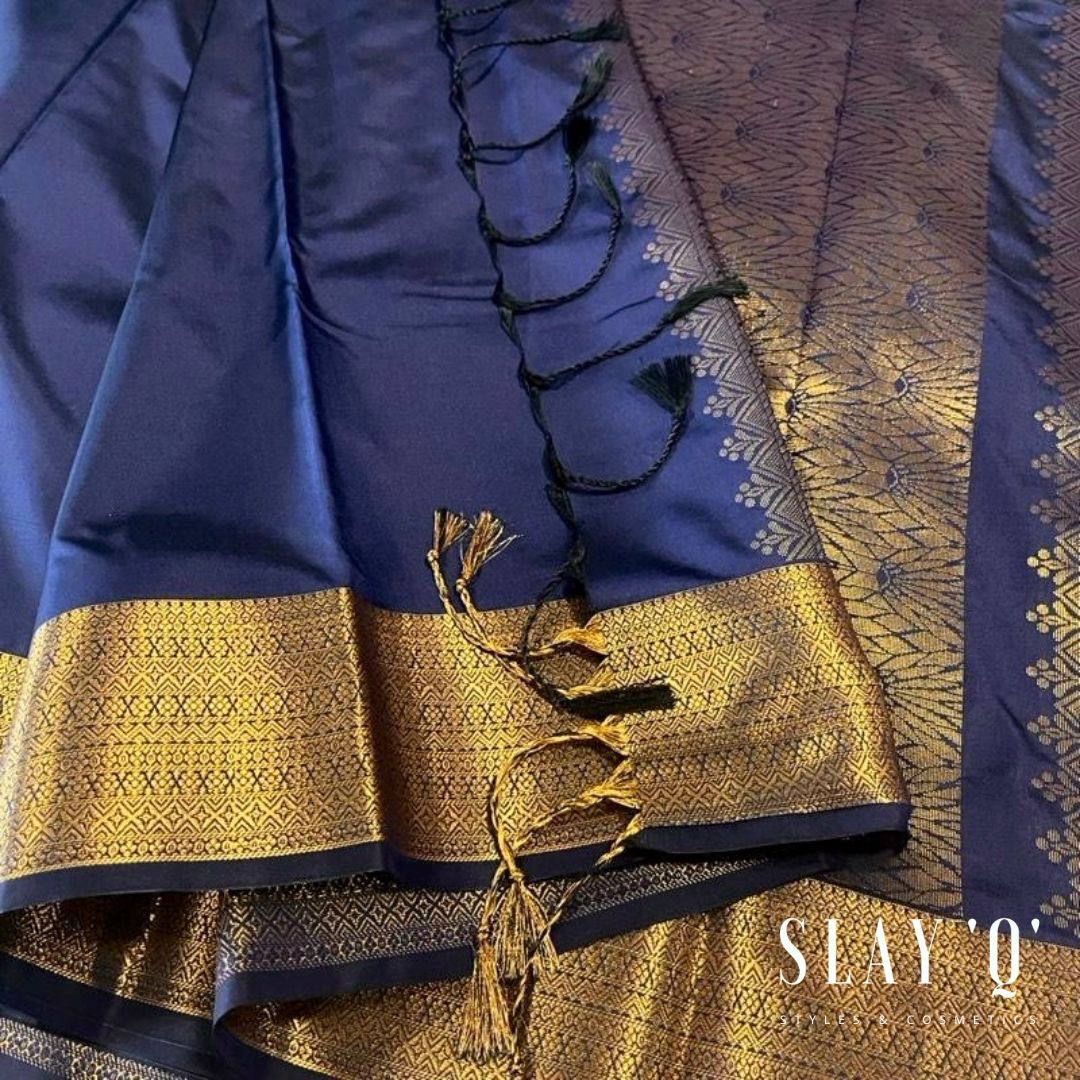 SLAY Q NESA SERIES | PLAIN PATTU SAREE WITH RUNNING BLOUSE & BEAUTIFUL GOLD ZARI BORDER | BRIDESMAID SAREE – NAVY BLUE