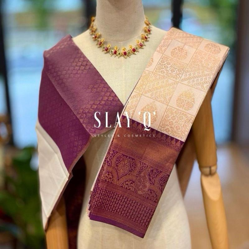 SLAY Q AASHI SERIES | BRIDESMAID SEMI SILK SAREE (SOFT FABRIC) – CREAM + PURPLE