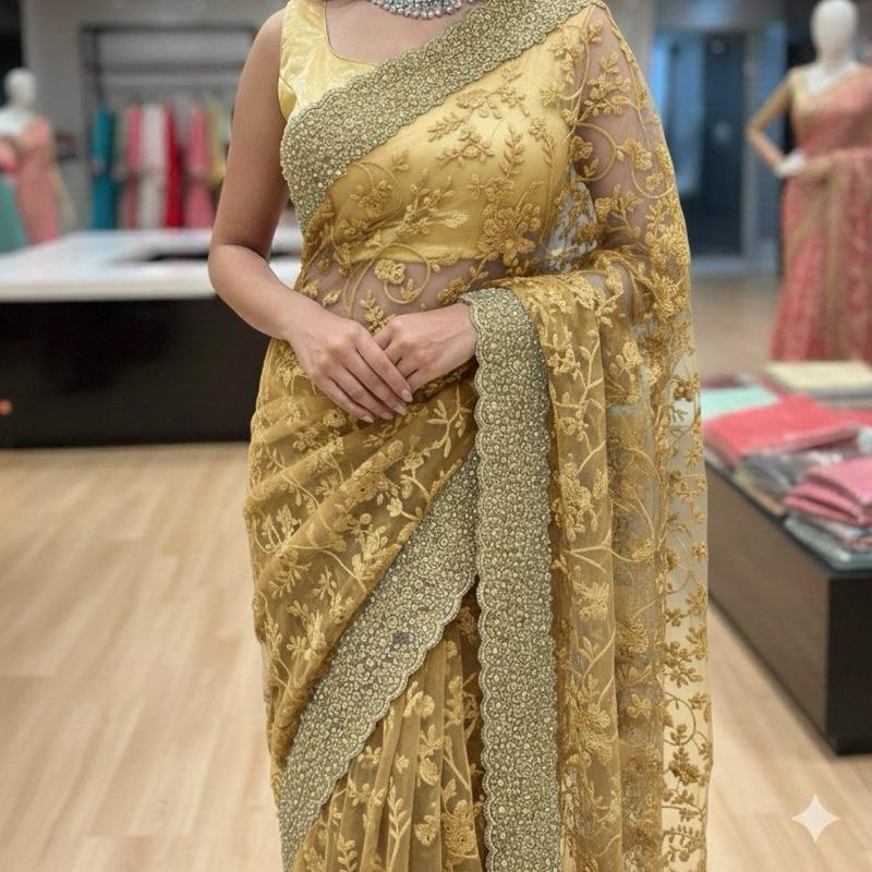 SLAY Q ILARA PREMIUM SOFT NET LACE SAREE SERIES | HEAVY PEARL EMBELLISHED BORDER | NORMAL DINNER SAREE | RUNNING BLOUSE Flowy – GOLDEN SAND