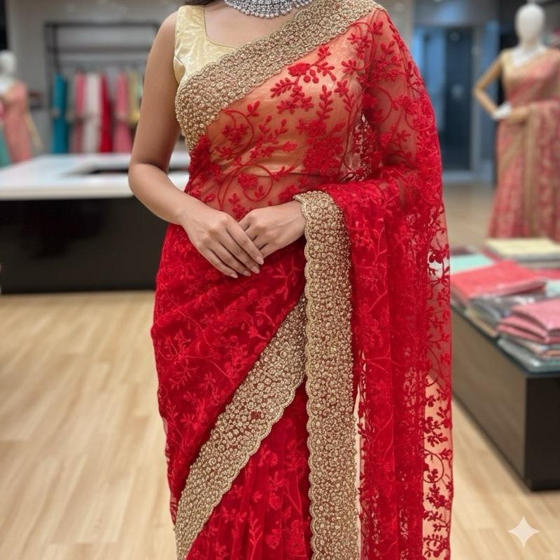 SLAY Q ILARA PREMIUM SOFT NET LACE SAREE SERIES | HEAVY PEARL EMBELLISHED BORDER | NORMAL DINNER SAREE | RUNNING BLOUSE Flowy – REVENGE RED